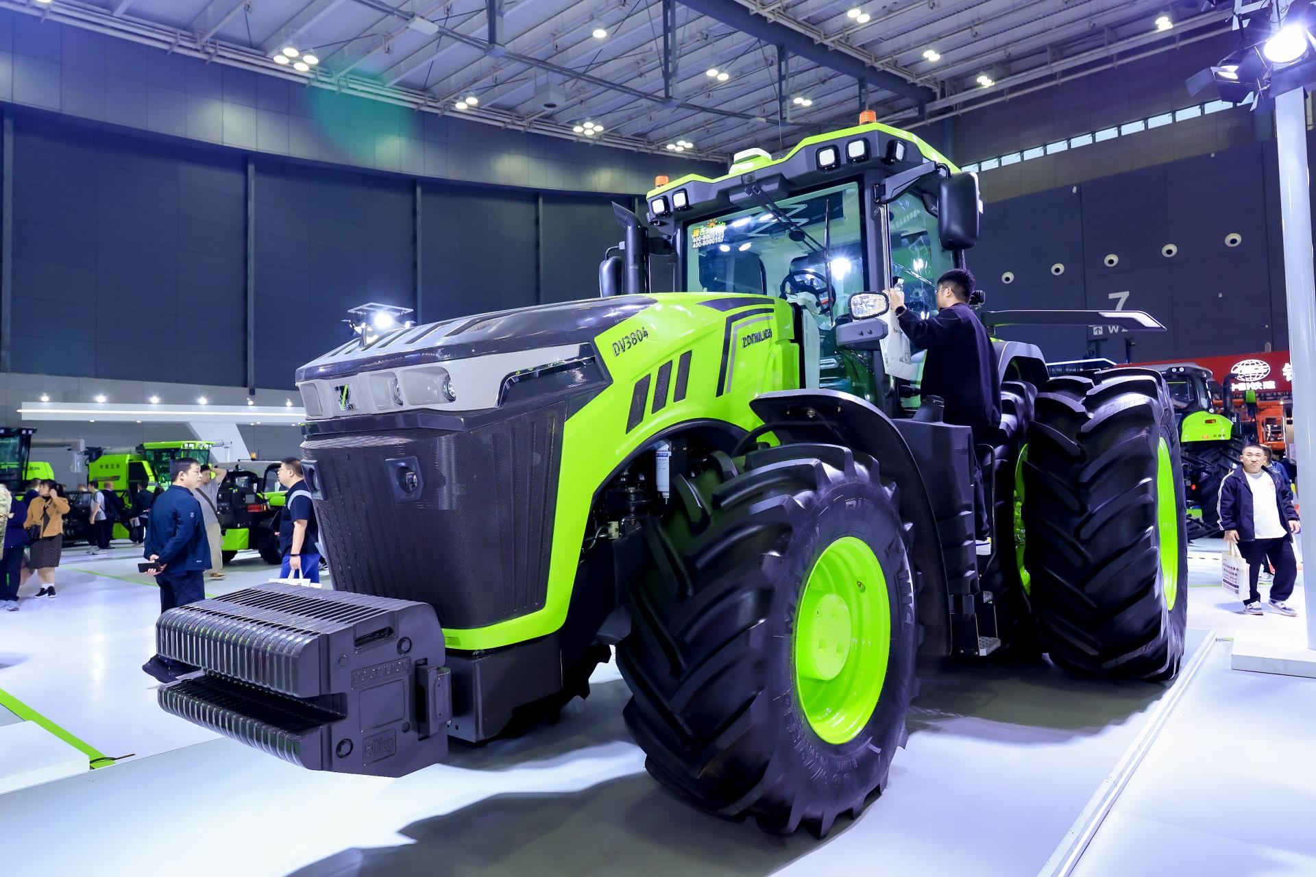中联重科自主研发的首款380马力DV3804混合动力拖拉机,则具有绿色智能、高效精准的亮点。它采用柴电混动系统,可应对多种作业工况,为用户带来非凡的收益;配备0~40km/h区间无极变速箱,作业效率更高,变速体验更平顺;行走采用电机直驱技术,起步更平顺,无动力跳跃。整机采用国际化设计理念,让驾驶更舒适、操作更便捷安全,并标配了导航及辅助驾驶功能,助力实施精准农业。